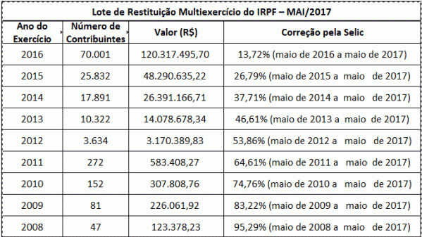 Os montantes de restituição para cada exercício e a respectiva taxa Selic aplicada para corrigir o valor podem ser acompanhados na tabela a seguir: