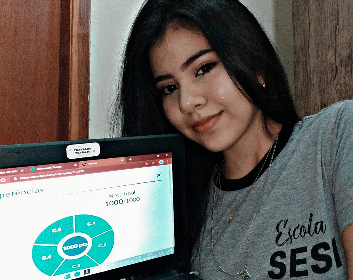 Em continuidade às aulas online adotadas em razão da pandemia mundial do novo coronavírus (Covid-19), a aluna Rosy Milena Goulart Barcellos, do 2º ano do Ensino Médio da Escola do Sesi de Corumbá, conseguiu a nota máxima de 1.000 pontos na redação do simulado realizado com os alunos por meio da plataforma Letrus. A ferramenta é utilizada pelas escolas do Sesi e que realiza correções de redação por meio de inteligência artificial humana, seguindo os padrões de correção do Enem.
