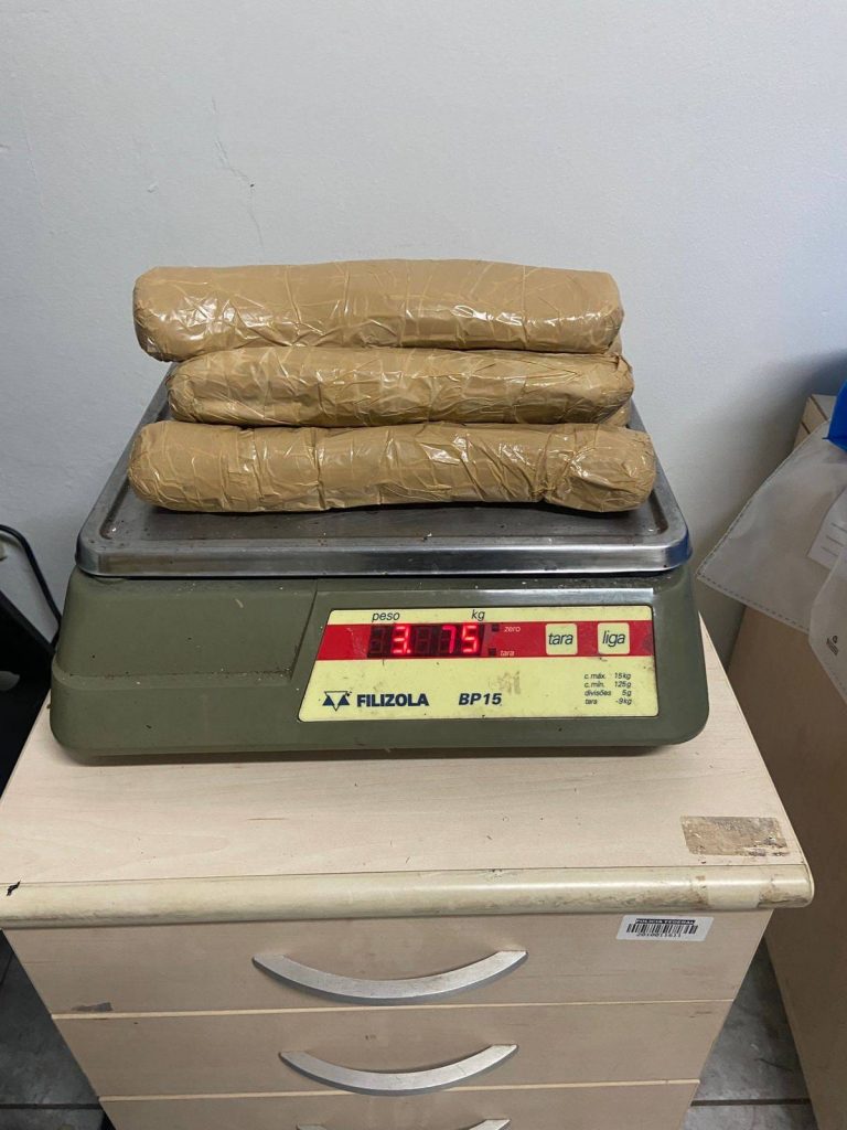 Cada suspeito foi flagrado com 2 tabletes dentro dos calçados, com formato similar a uma palmilha, ajudando na camuflagem do ilícito. No total, os 6 invólucros pesaram 3,075 Kg de pasta base.