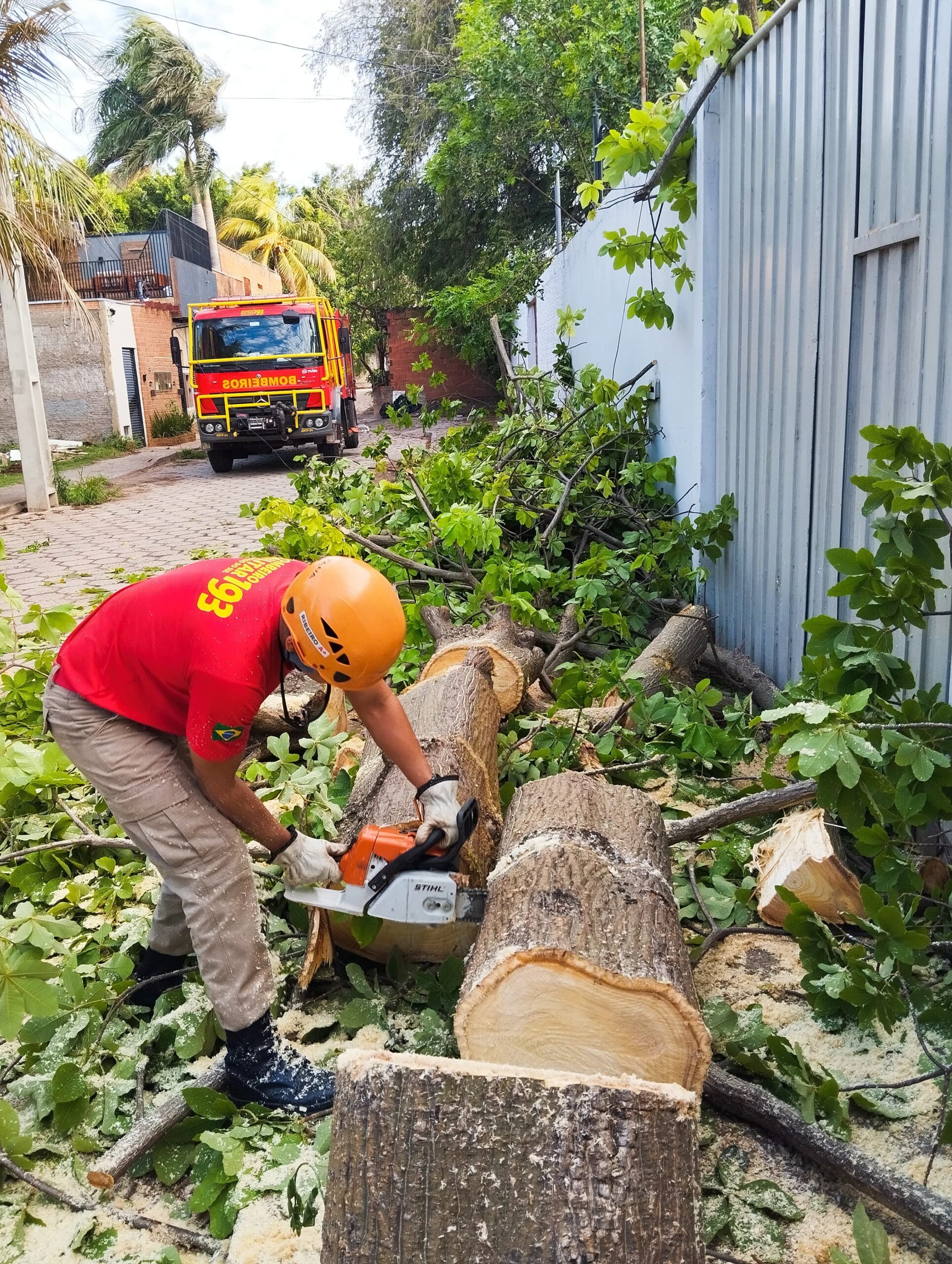 Os bombeiros avaliaram as condições de segurança e realizaram o corte e a remoção dos galhos, restabelecendo a entrada da casa. Após o serviço, o local foi deixado seguro, e os moradores receberam orientações sobre cuidados em períodos de chuva e ventos fortes.
