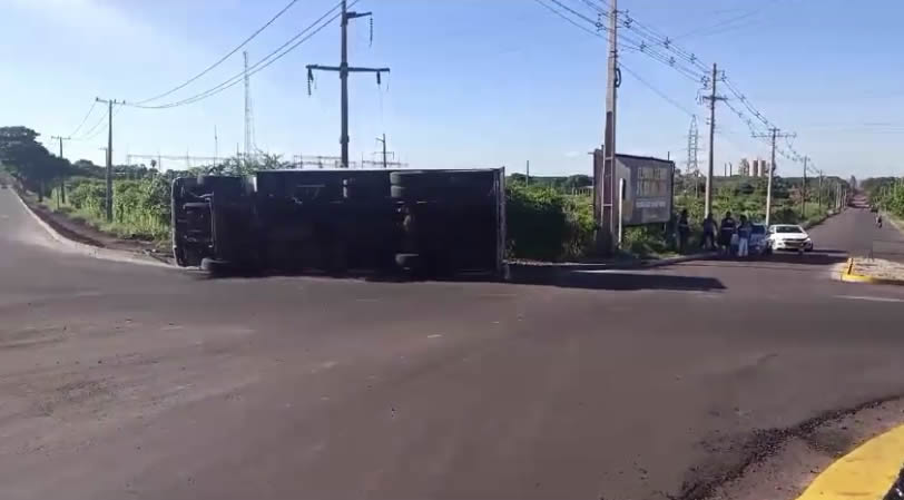 Um caminhão tombou ao realizar uma curva na rotatória que liga a avenida Senador Paulino Lopes da Costa e a rua Nossa Senhora do Carmo, no bairro Padre Ernesto Sassida, na entrada da cidade. O acidente aconteceu por volta das 16h desta sexta-feira, 26 de janeiro.