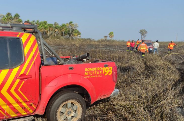 Equipes do Corpo de Bombeiros Militar de Mato Grosso do Sul atuam no combate a três incêndios florestais no Pantanal, nas regiões do Nabileque, Salobra e Paiaguás.
