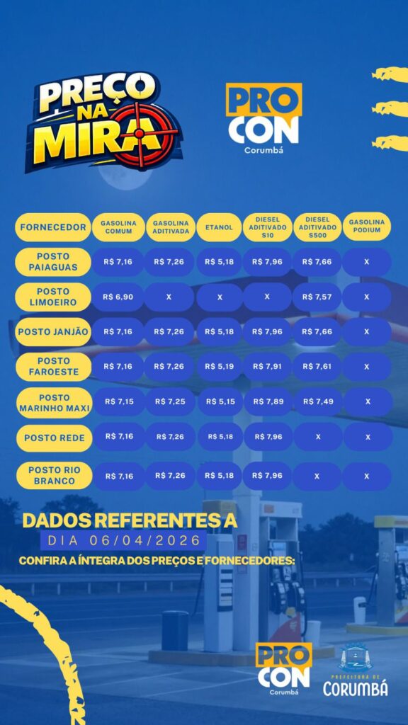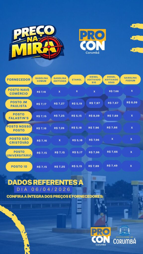 O PROCON Corumbá inicia, a partir deste mês de abril, a operação “Preço na Mira”, uma ação estratégica de monitoramento diário dos preços dos combustíveis no município, alinhada às diretrizes da Secretaria Nacional do Consumidor (Senacon), vinculada ao Ministério da Justiça.