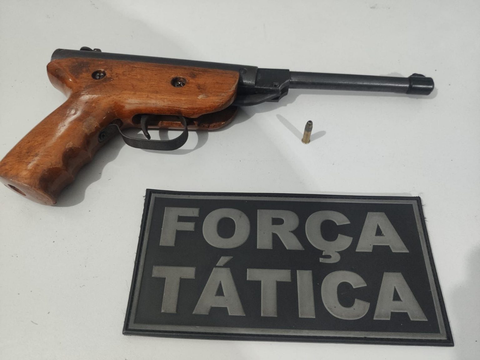 A arma de fogo foi entregue à equipe policial, e se tratava de uma arma artesanal de pressão adaptada ao calibre .22, com uma munição deflagrada.