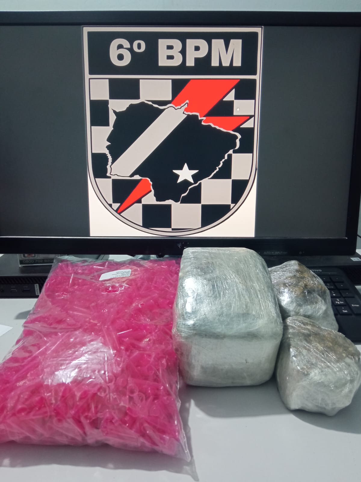 Durante a busca no local, os policiais encontraram aproximadamente 615 gramas de maconha e pinos plásticos usados para armazenar cocaína. A vítima e o autor foram encaminhados à 1ª Delegacia de Polícia Civil.