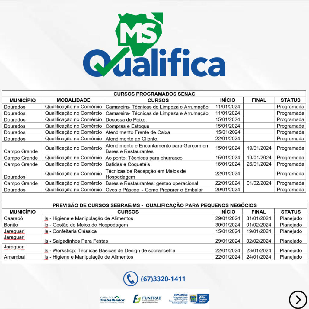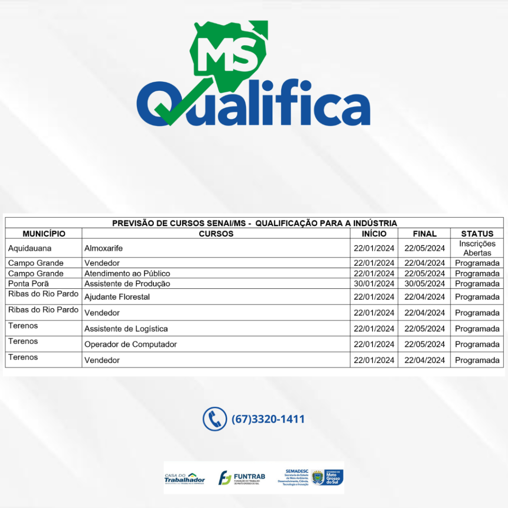 Não perca a oportunidade de se qualificar e entrar para o mercado de trabalho. Mais informações e inscrições basta entrar em contato através do telefone (67) 3320-1411.