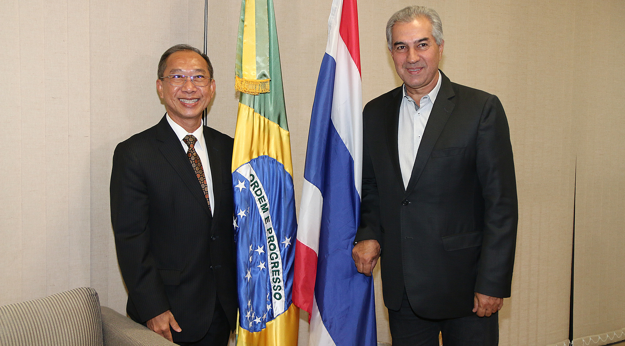 O governador Reinaldo Azambuja se reuniu nesta segunda-feira (22) com o embaixador do Reino da Tailândia no Brasil, Surasak Suparat, que veio a Mato Grosso do Sul para participar do seminário Thailand Roadshow, organizado pela Fecomércio.