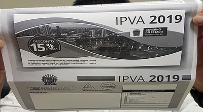 Canhoto onde serão autenticados os pagamentos efetuados pelo contribuinte, de acordo com a modalidade de pagamento escolhida. É o comprovante que o contribuinte tem de que suas obrigações foram quitadas. O canhoto é composto dos campos: exercício do imposto (2019), nome do proprietário do veículo e dados do veículo (placa, número do RENAVAM, marca e modelo, ano de fabricação, cor predominante, município de registro, número do chassi) – primeira janela do canhoto. Na segunda janela, constam os campos: valor venal do veículo, alíquota de cálculo do imposto e valor total do IPVA (sem desconto) e abaixo, os valores discriminados para pagamento, seja em cota única ou parcelados. Além das janelas citadas, constam as janelas destinadas as autenticações, de acordo com a modalidade escolhida de pagamento.