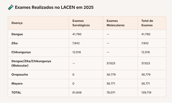 Neste ano, o Lacen realizou quase 140 mil exames laboratoriais voltados ao diagnóstico de arboviroses. Confira detalhes na tabela.