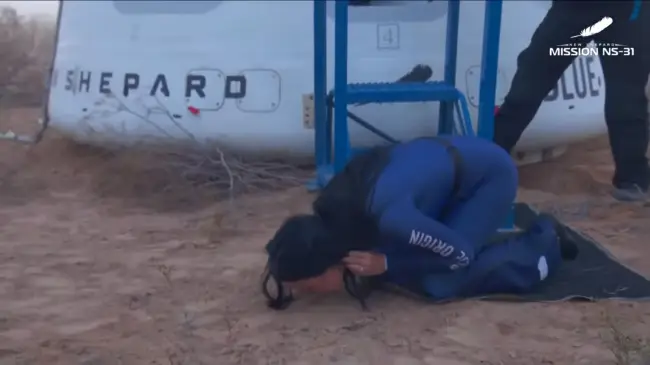 Ao pisar novamente na terra, Katy Perry beijou o chão e declarou: “essa experiência foi a segunda [melhor da minha vida], logo após me tornar mãe”. (Blue Origin / YouTube/Reprodução)
