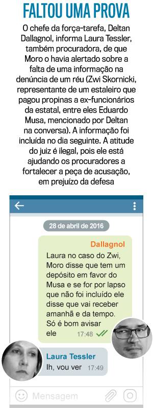 Não seria um escândalo se um magistrado atuasse nas sombras alertando um advogado de que uma prova importante para a defesa de seu cliente havia ficado de fora dos autos? Pois isso aconteceu na Lava-Jato, só que em favor da acusação. Uma conversa de 28 de abril de 2016 mostra que Moro orientou os procuradores a tornar mais robusta uma peça. No diálogo, Deltan Dallagnol, chefe da força-tarefa em Curitiba, avisa à procuradora Laura Tessler que Moro o havia alertado sobre a falta de uma informação na denúncia de um réu — Zwi Skornicki, representante da Keppel Fels, estaleiro que tinha contratos com a Petrobras para a construção de plataformas de petróleo, e um dos principais operadores de propina no esquema de corrupção da Petrobras. Skornicki tornou-se delator na Lava-Jato e confessou que pagou propinas a vários funcionários da estatal, entre eles Eduardo Musa, mencionado por Dallagnol na conversa. “Laura no caso do Zwi, Moro disse que tem um depósito em favor do Musa e se for por lapso que não foi incluído ele disse que vai receber amanhã e da tempo. Só é bom avisar ele”, diz. (VEJA manteve os diálogos originais com eventuais erros de digitação e ortografia.) “Ih, vou ver”, responde a procuradora. No dia seguinte, o MPF incluiu um comprovante de depósito de 80 000 dólares feito por Skornicki a Musa. Moro aceita a denúncia minutos depois do aditamento e, na sua decisão, menciona o documento que havia pedido. Ou seja: ele claramente ajudou um dos lados do processo a fortalecer sua posição.