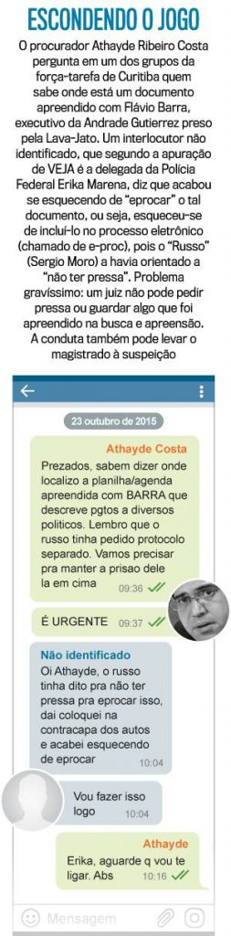 Diante da reclamação, Zavascki cobra explicações de Moro, que diz não saber nada sobre o envolvimento de parlamentares. Mesmo assim, com base nas informações da defesa, o ministro do STF suspende em 2 de outubro as investigações, o que força o então juiz a remeter o caso de Curitiba para Brasília três dias depois. Seu comportamento perante Zavascki foi impróprio, como evidencia um diálogo registrado no Telegram dezoito dias depois entre o procurador Athayde Ribeiro Costa e a delegada Erika Marena, da Polícia Federal. Costa diz precisar com urgência de uma “planilha/agenda” apreendida com Barra que descreve pagamentos a diversos políticos. Marena responde que, por orientação de “russo” (Moro), não tinha tido pressa em “eprocar” a planilha (tradução: protocolar o documento no sistema eletrônico da Justiça). “Acabei esquecendo de eprocar”, disse. “Vou fazer isso logo”, completa.