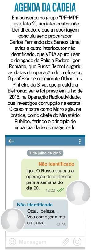 O papel de líder da Lava-Jato em Curitiba é exercido em diversas oportunidades pelo ex-juiz. Em mais de uma ocasião, Moro aparece nos chats do Telegram interferindo na agenda dos procuradores da força-tarefa, outra atitude que gera a suspeição de qualquer magistrado. Em 7 de julho de 2015, por exemplo, um membro da força-tarefa, que a reportagem de VEJA identificou ser o procurador Carlos Fernando dos Santos Lima, escreve o seguinte: “Igor. O Russo (Moro) sugeriu a operação do professor para a semana do dia 20”. Igor (o delegado da Polícia Federal Igor Romário) responde: “Opa… beleza… Vou começar a me organizar”. De acordo com a apuração da revista, o “professor” era o almirante Othon Luiz Pinheiro da Silva, da Eletronuclear. Ele acabou sendo preso no dia 28. Em outro episódio, Moro não apenas sugere uma data para a operação como também já fala em receber a denúncia. O caso em questão aparece em um diálogo ocorrido em 13 de outubro de 2015. Nele, o procurador Paulo Galvão, o PG, alerta Roberson Pozzobon, seu colega da força-tarefa, sobre uma orientação do juiz. “Estava lembrando aqui que uma operação tem que sair no máximo até por volta de 13/11, em razão do recesso e do pedido do russo (Moro) para que a denúncia não saia na última semana”, escreve PG. “Após isso, vai ficar muito apertado para denunciar.” Pozzobon concorda com PG e acrescenta: “uma grande operação por volta desta data seria o ideal. Ainda é próximo da proclamação da república. rsrs”.