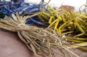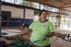 Uma das ministrantes da oficina, a presidente da Associação Mulheres de Fibra de Ladário, Lúcia da Costa Vieira, explica que a matéria-prima, a fibra de aguapé, ou camalote, é retirada diretamente do Rio Paraguai. Nós entramos no rio, recolhemos a fibra e deixamos secar por uma semana, para depois tingir com tinta cilíaco a álcool ou trabalhar no cru mesmo. Um dia depois já pode trabalhar. É melhor trabalhar com a fibra úmida, para não quebrar”.
