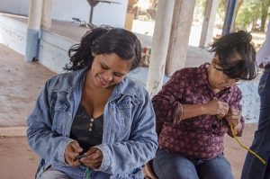 Fermina Velasquez, pensionista, e sua filha Elizete Márcia de Assis, diarista, ficaram sabendo do curso por meio da presidente da Associação. Elas têm contato com o artesanato de fibra de aguapé pela primeira vez durante o Fasp. “Achei lindo o artesanato delas, quero também começar a vender. É um dinheirinho que vai entrar. Além disso, distrai, você vai se interessando cada vez mais”, diz Fermina.