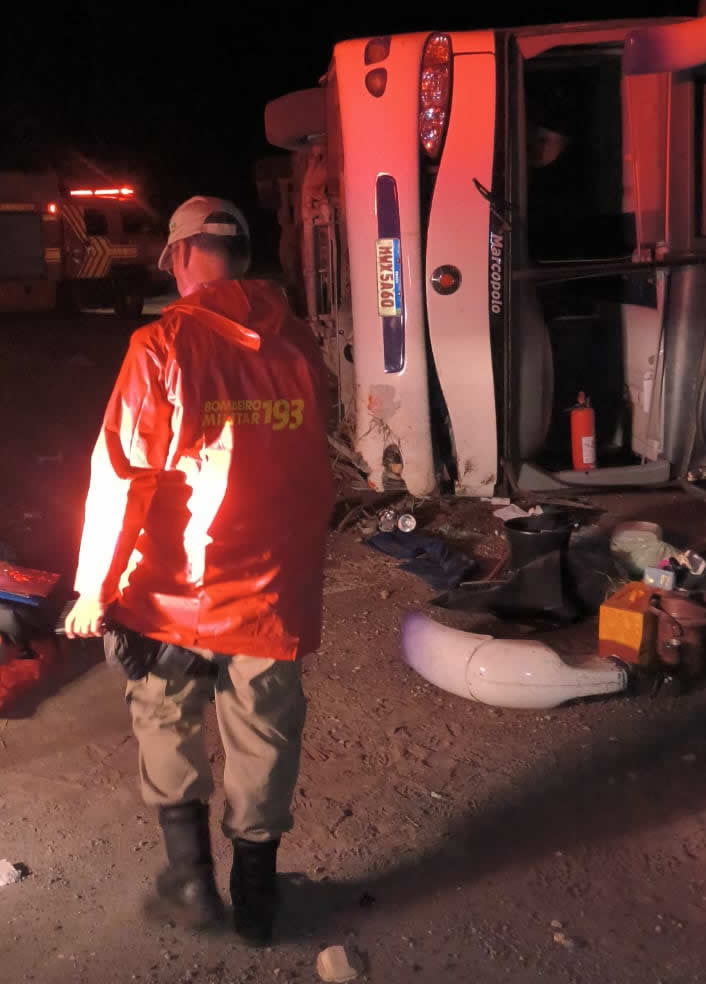 Um ônibus tombou na rotatória da Lajinha, na BR-262, logo depois do Posto Fiscal do Lampião Aceso, a cerca de 15 km distante da área urbana de Corumbá,