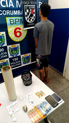 A equipe de Força Tática da Polícia Militar prendeu um homem de 24 anos por tráfico de drogas por volta de meio dia desta terça-feira, 14 de maio. A equipe foi acionada para atender uma denúncia de violência doméstica no Conjunto Flamboyant III, no Loteamento Pantanal quando avistou o indivíduo em atitude suspeita. Em revista pessoal os policiais encontraram um grande porção de maconha e realizaram uma busca minuciosa no interior do imóvel em que o suspeito estava já que havia conhecimento que o local era usado para comercialização de drogas. Os militares encontraram uma grande porção de pasta base, tabletes de maconha, 95 unidades de LSD (Ácido Lisérgico Dietilamida), celulares, dinheiros em notas trocadas, além de plásticos, que seriam utilizados para embalagens das drogas.