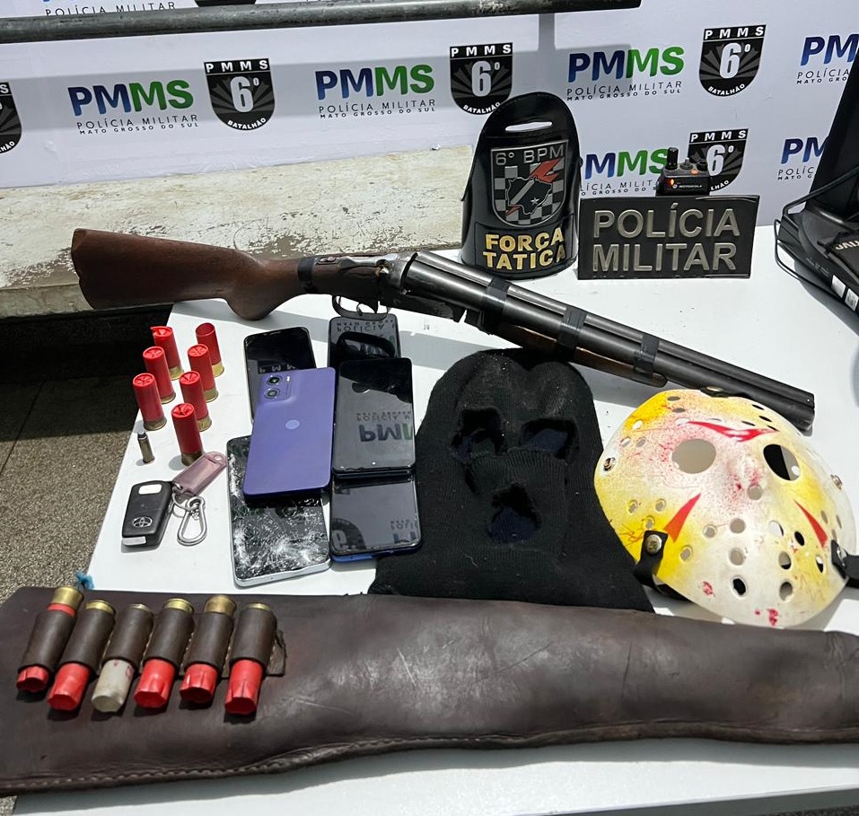 Durante buscas no alojamento foram localizadas a espingarda utilizada na ameaça, diversas munições calibre 12, além de uma munição calibre .38. Também foram encontradas no veículo uma balaclava de cor preta e outras munições calibre 12.
