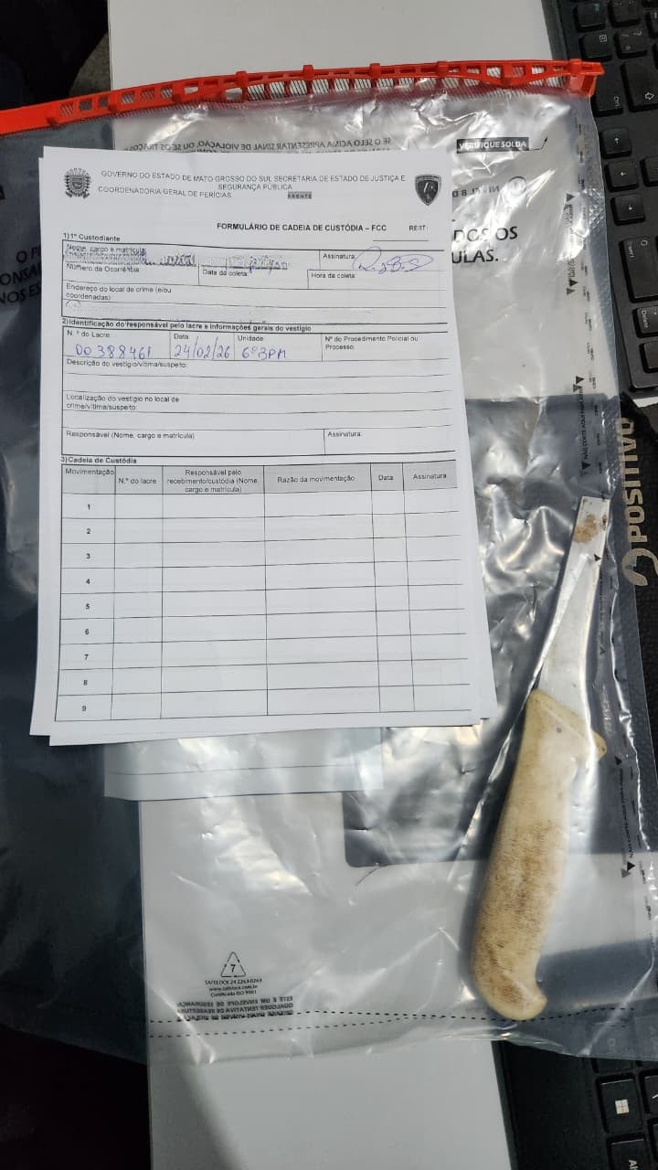 Durante a intervenção, os policiais presenciaram o momento em que o autor descartou a faca no chão. O objeto, com lâmina de aproximadamente 10 centímetros, foi apreendido e encaminhado à Delegacia de Polícia Civil. O suspeito também foi conduzido à unidade policial, onde continuou proferindo ofensas e ameaças contra a equipe. A vítima manifestou interesse em representar criminalmente contra ele.