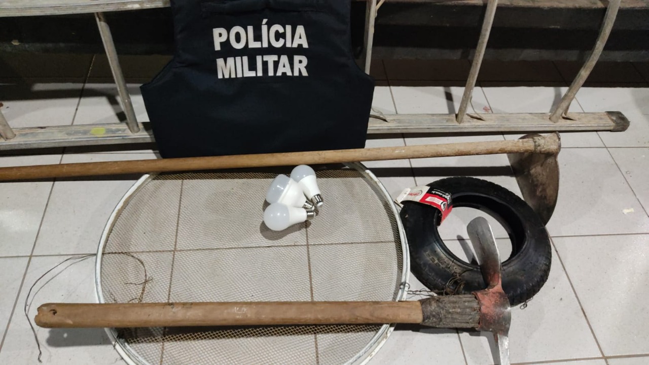 Em rondas os policiais viram o autor carregando os objetos. Ao perceber a viatura, o autor correu e se escondeu em um terreno baldio. Após buscas ele foi localizado deitado no mato juntamente com uma enxada, uma picareta, um pneu de carrinho de mão, uma escada de alumínio, uma peneira de pedreiro e três lampadas de led.