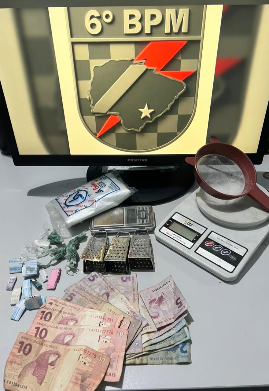 Na residência onde ocorreu a abordagem, no bairro Maria Leite, foram encontradas duas balanças de precisão, três raladores com vestígios de droga, uma peneira e embalagens plásticas utilizadas no preparo e comercialização dos entorpecentes.