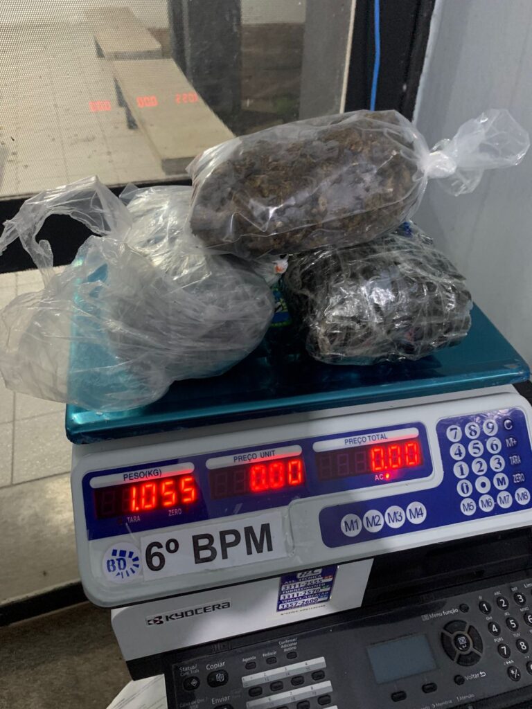 No interior do imóvel foram localizados 1,055 quilos de maconha, 96 g de cocaína, sendo 33 porções prontas para venda, duas balanças de precisão, plásticos, peneira e utensílios usados no preparo da droga.