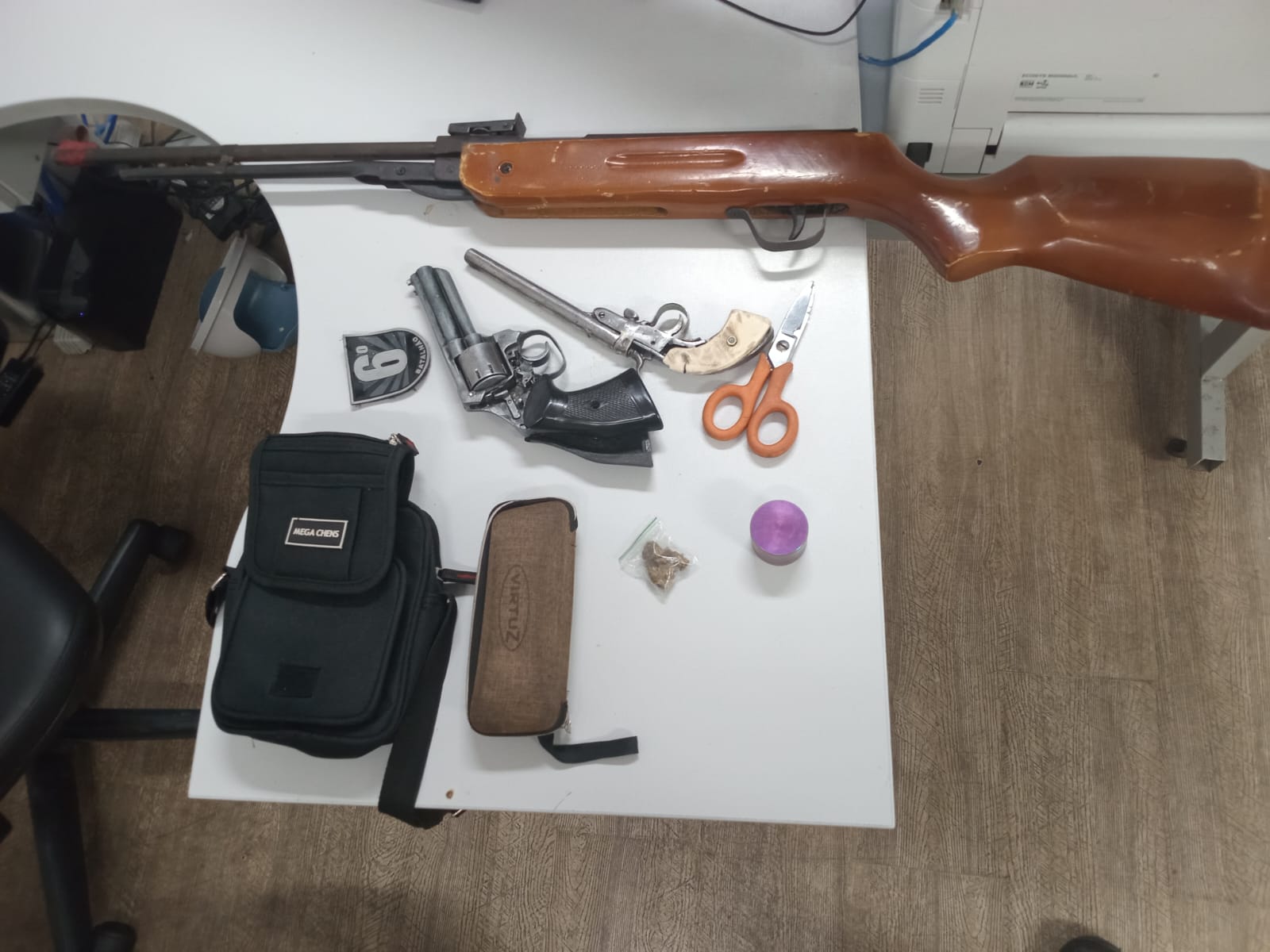 Ao abordar um veículo que correspondia às características informadas, foram encontrados três indivíduos no interior do automóvel. Na ação, os policiais apreenderam três armas de fogo: uma garrucha calibre 22, um revólver calibre 22 e uma espingarda adaptada para calibre 22. Também foram recolhidas munições e uma porção de maconha.