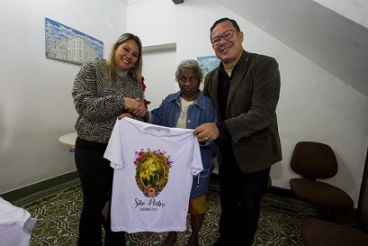 Nesta sexta-feira, 8 de junho, a primeira-dama e secretária especial de Cidadania e Direitos Humanos, Amanda Balancieri Iunes, e o diretor-presidente da Fundação da Cultura e do Patrimônio Histórico de Corumbá, Joilson Cruz, entregaram as camisetas da festa à senhora Ivone Torres de Moraes.