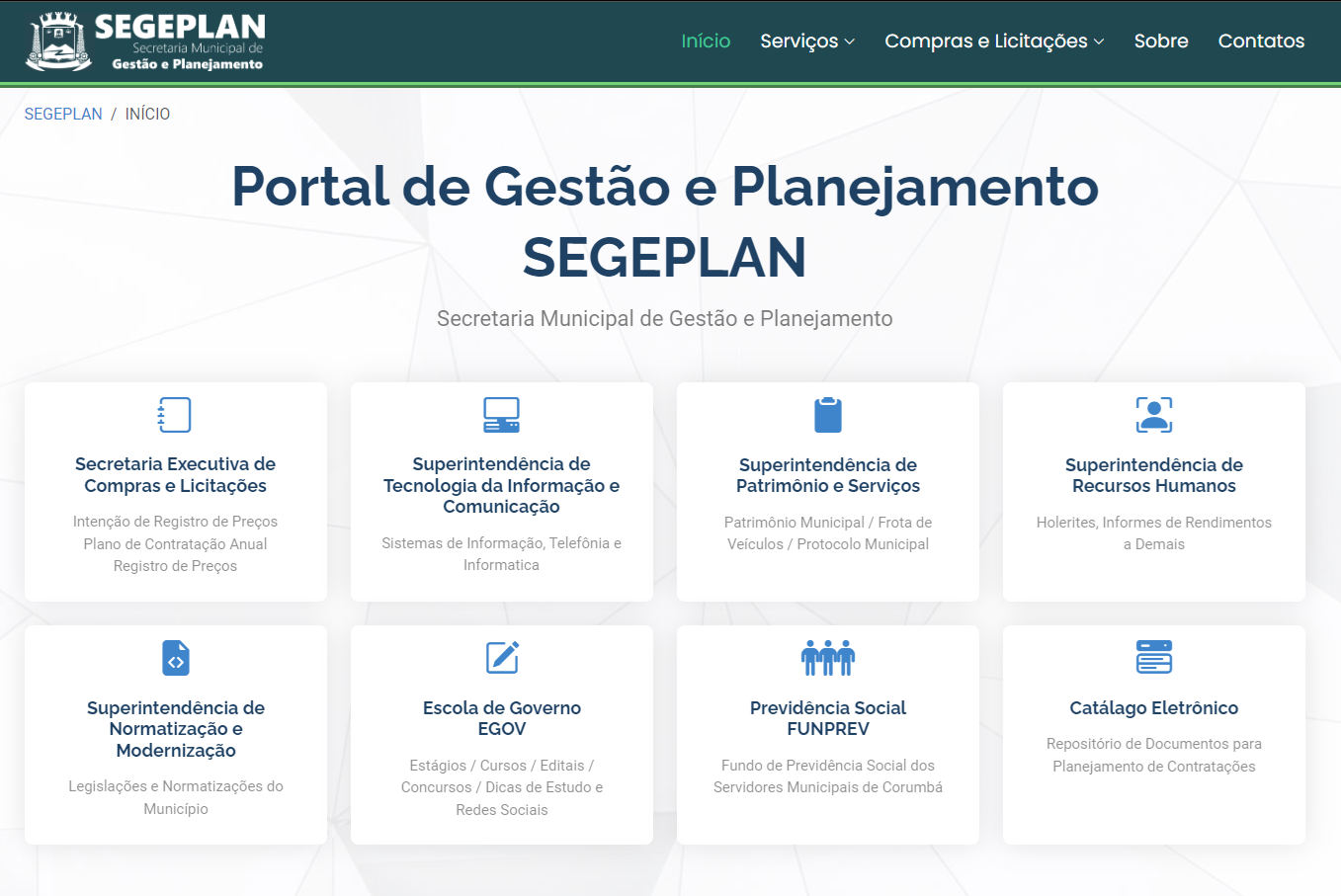 A Prefeitura de Corumbá implementou mais uma ferramenta digital que amplia e facilita a acessibilidade e a transparência das ações do Executivo municipal. O novo portal da Secretaria Municipal de Gestão e Planejamento (planejamento.corumba.ms.gov.br) reúne, em uma única área, todos os serviços oferecidos pelas: