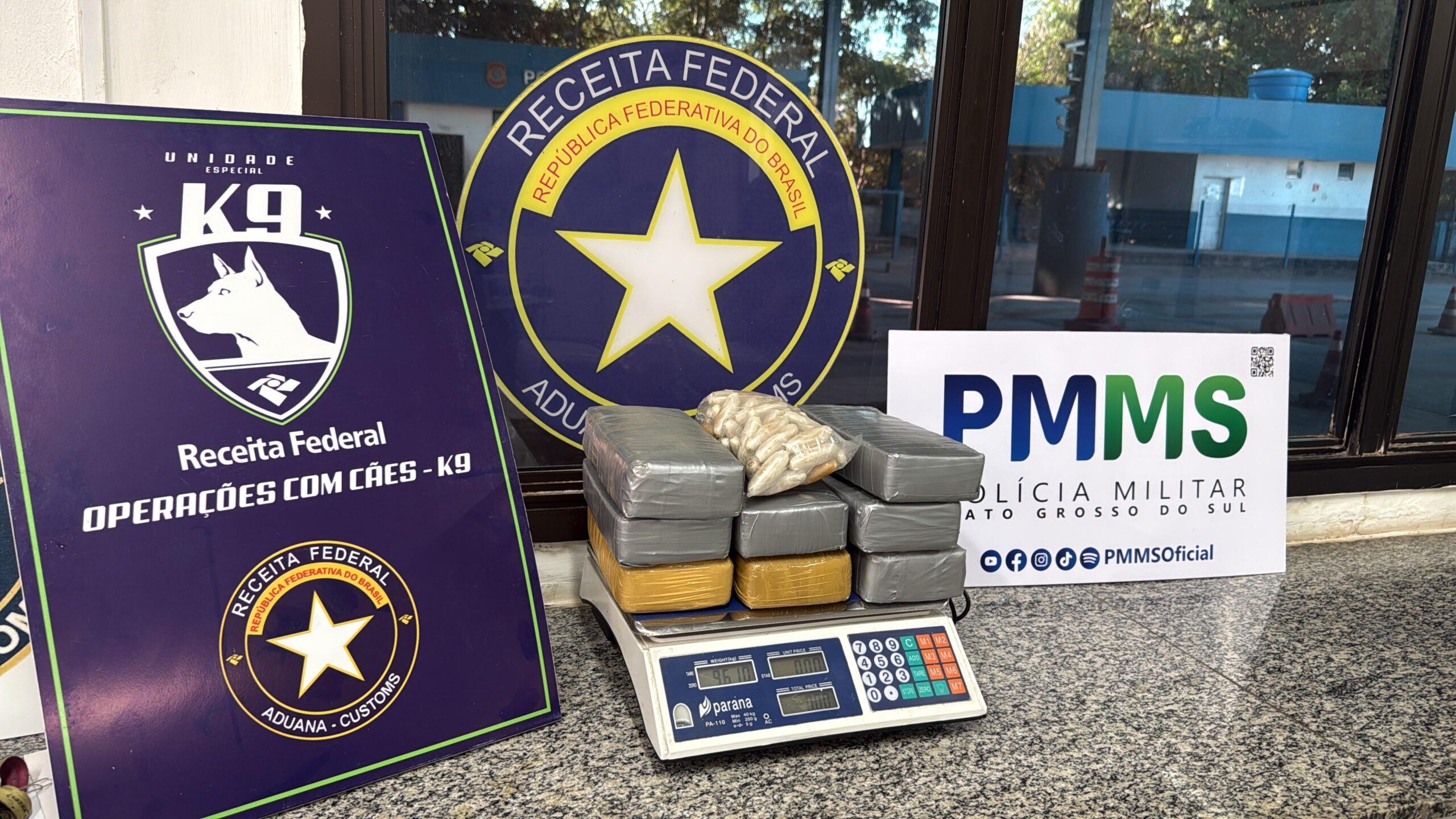Durante a operação, o Cão de Faro da Receita Federal localizou uma garrafa de suco abandonada que continha cápsulas de substância análoga à pasta base de cocaína. Em nova busca, o animal identificou na parte traseira do veículo nove tabletes da mesma substância. No total, foram apreendidos aproximadamente dez quilos de drogas, sem identificação do responsável.