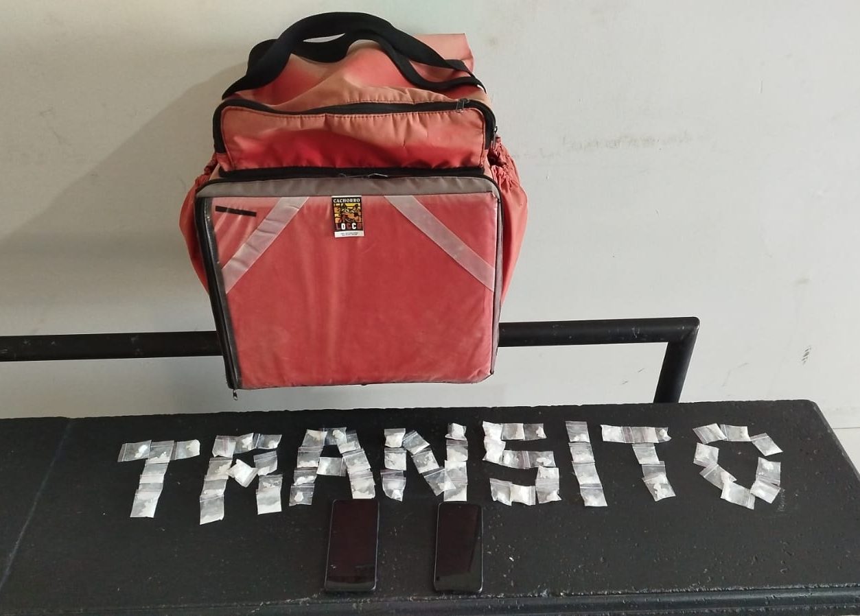 Já hoje (8), os policiais abordaram outro motociclista, desta vez com uma “bag” térmica de “motoboy”, que tinha em posse 65 porções de cocaína (totalizando 90 gramas) acondicionadas em uma “pochete” presa a sua cintura. Ainda localizaram dois aparelhos celulares, um de uso particular e outro para a entrega de droga – conforme relatou o homem de 32 anos.