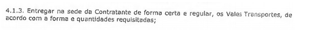 Além disso, no contrato assinado pela ex-chefe da Secretaria da Saúde, Dinaci Vieira Marques Ranzi, existia a cláusula 4.1.3 (imagem abaixo) que menciona que os vales-transportes deveriam ser entregues na sede da contratante de forma certa e regular. Acontece que, de acordo com as testemunhas do processo – servidores públicos (à época) – a impressão dos bilhetes era feita no próprio prédio da Prefeitura (contratante).