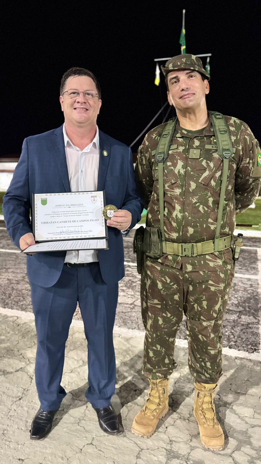 O vereador e presidente da Câmara Municipal de Corumbá, Ubiratan Canhete de Campos Filho, o Bira, recebeu o título Amigo da Brigada, concedido pela 18ª Brigada de Infantaria do Pantanal, na noite desta sexta-feira (19). A honraria foi entregue pelo general José Fernandes C. dos Santos Filho e reconhece a parceria institucional entre o Legislativo Municipal e o Exército Brasileiro.